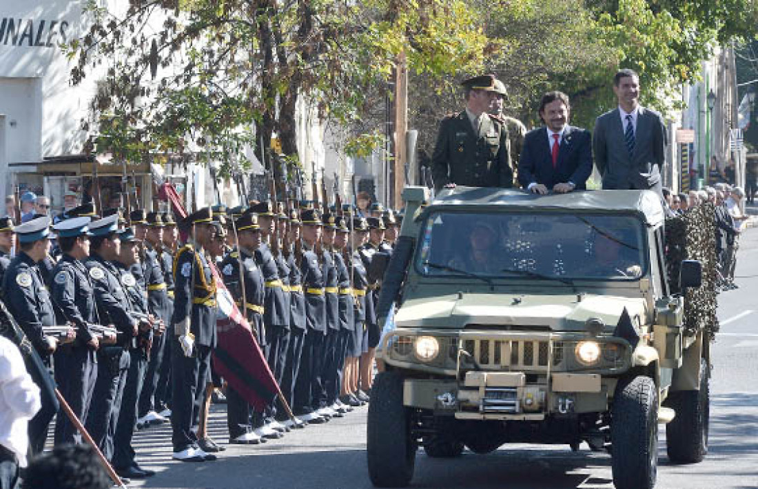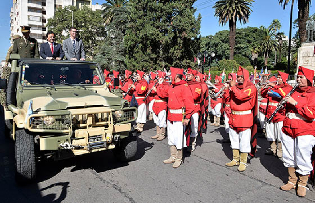 El mandatario participó del desfile cívico militar desarrollado este sábado frente a la plaza Güemes, donde se emplaza la estatua que recuerda al fundador de la ciudad, Hernando de Lerma.