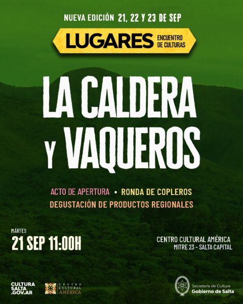 Ministerio de Educación y Cultura Noticias de Salta Cultura 21/09/2021 06:30Luego de las exitosas ediciones de “Lugares, Encuentro de Culturas” con Tolar Grande, San Antonio de los Cobres y Oran, llega toda la cultura y el arte de La Caldera y Vaqueros el 21, 22 y 23 de septiembre.