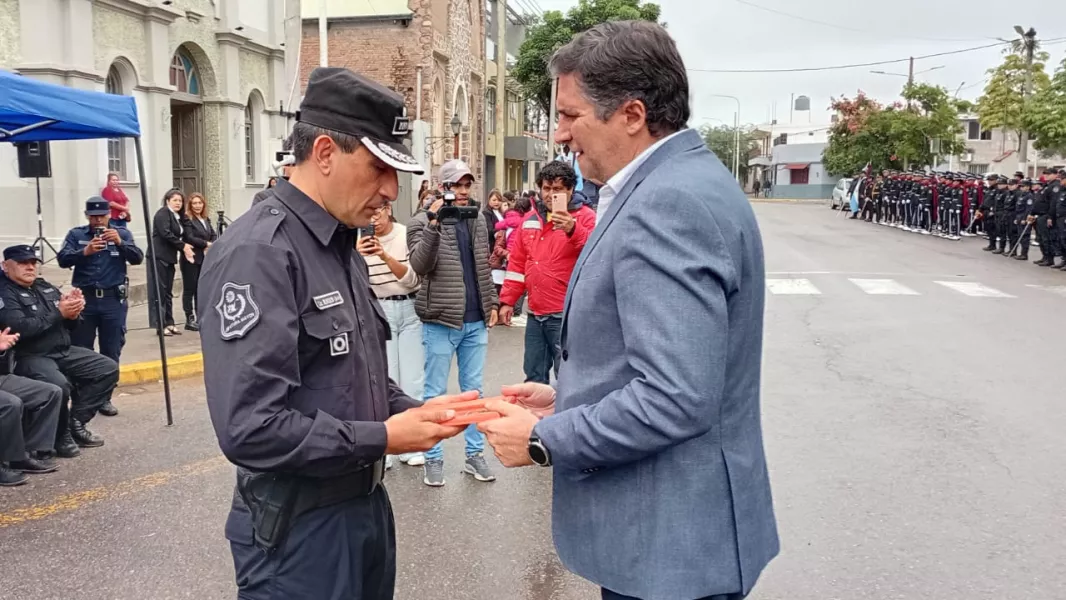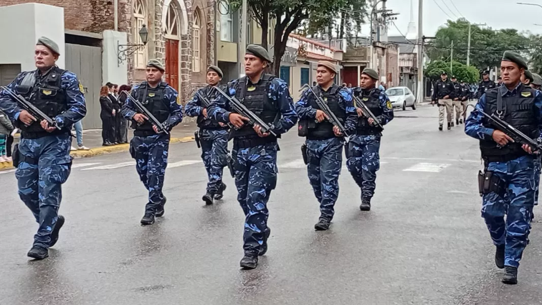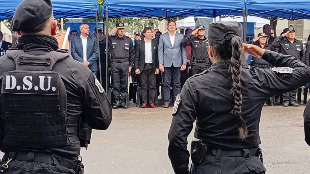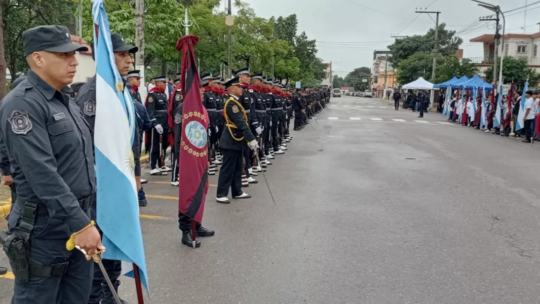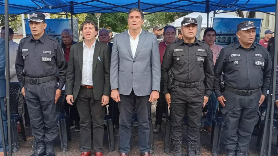 El secretario de Seguridad, Nicolás Avellaneda, el intendente de General Güemes, Carlos Rosso, el subjefe de Policía, Walter Toledo y el director del Distrito de Prevención 7, Guido Burgos, encabezaron el acto por el cuarto aniversario de la institución policial realizado en la plaza principal del municipio.