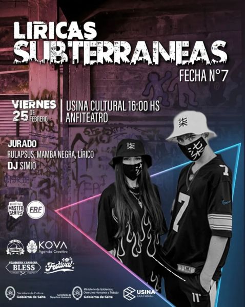 Ministerio de Gobierno y Justicia Noticias de Salta Derechos Humanos 22/02/2022 14:07El viernes 25 se realizará la séptima y última fecha de Liricas Subterráneas, la competencia de rap que convoca a jóvenes a promover vidas libres de violencias desde la cultura preventiva. Será en la Usina Cultural desde las 16 horas.