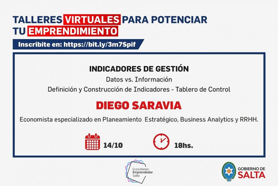 En el marco de las acciones de capacitación y perfeccionamiento para emprendedores que lleva adelante el Ministerio de Producción y Desarrollo Sustentable, la Subsecretaría de Comercio y MiPyEs brindará las temáticas: Indicadores de gestión, Datos versus información, Definición y Construcción de Indicadores, Tablero de Control.