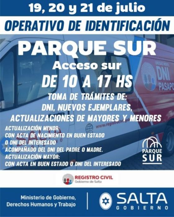 Continuando con el plan establecido para el recorrido del Móvil de toma de trámites identificatorios del Registro Civil, hasta el viernes el móvil permanecerá en el Parque del Sur, ingresando por el acceso sur del predio, de 10 a 17 horas.