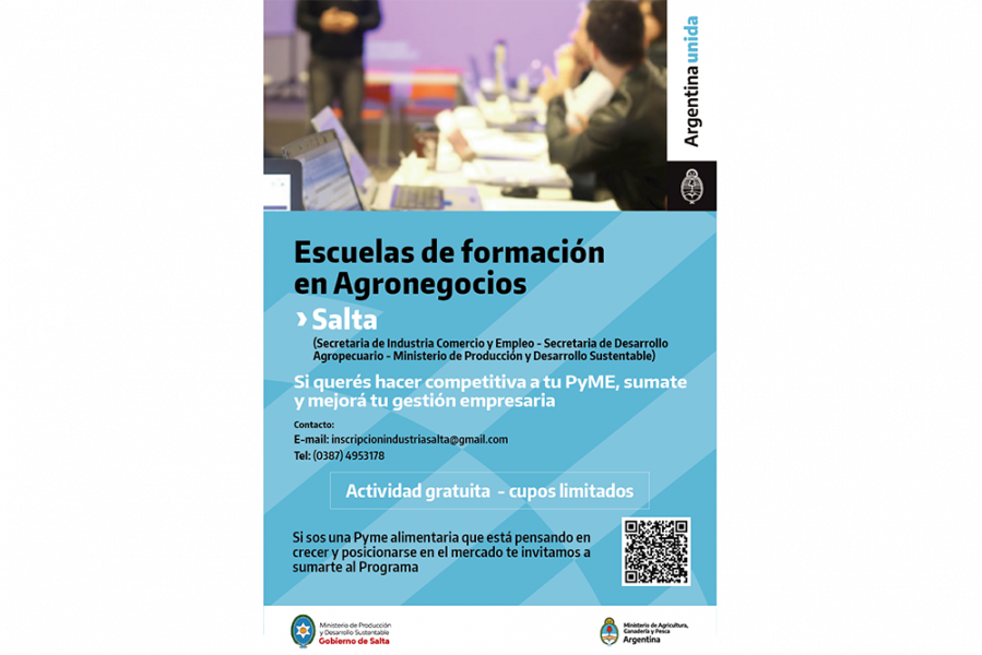 Ministerio de Producción y Minería Noticias de Salta Capacitación 05/08/2021 09:44La convocatoria gratuita está dirigida a propietarios y gerentes de empresas elaboradoras de productos que posean algún tipo de agregado de valor, radicadas en Salta o en provincias vecinas, quienes recibirán entrenamiento personalizado en las Escuelas de Formación en Agronegocios.