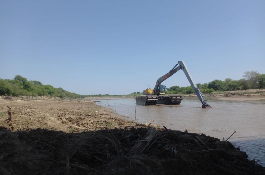 Personal de la Secretaría de Recursos Hídricos continúa trabajando en la ejecución de tareas de limpieza, refuerzo y construcción de defensas en el río Pilcomayo en Santa Victoria Este, en la zona del Puente Internacional de Misión La Paz.