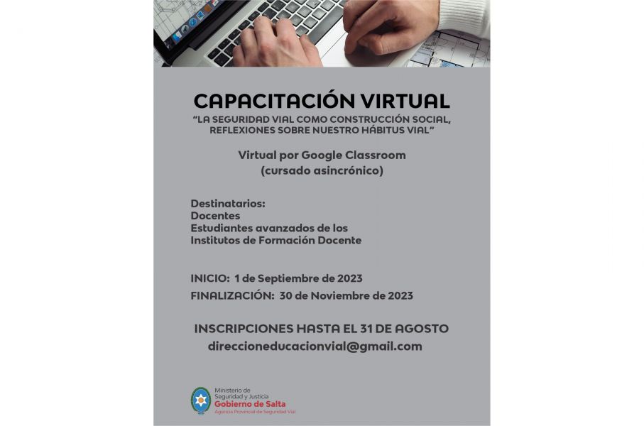 Ministerio de Seguridad Noticias de Salta Seguridad 23/08/2023 05:47Profesionales de la Agencia Provincial de Seguridad Vial dictarán un curso virtual con puntaje sobre “La Seguridad Vial como construcción social, reflexiones sobre nuestro habitus vial”, destinado a docentes y estudiantes avanzados de los Institutos de Formación Docente. Las inscripciones serán hasta el 31 de agosto.